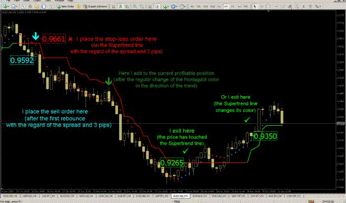 Sell: a dot of Nonlagdot changes from blue to red. At the same time dots of nonlagdot should be under the Supertrend line. Also the Supertrend line should be red. A position should be opened by execution of a pending order. The order is placed on the lower point of the market extremum, which is formed after the first rebounce of the market upward (when closing price is higher than previous one). That is one should wait untill the price has exceeded the point of extremum, and only then sell. However, if the price fails to exceed the level of the point of extremum, one should wait. After the formation of a new point of the market extremum, the order should be shifted to that point. If the color of nonlagdot or supertrend changes to blue, the order shoud be canceled.