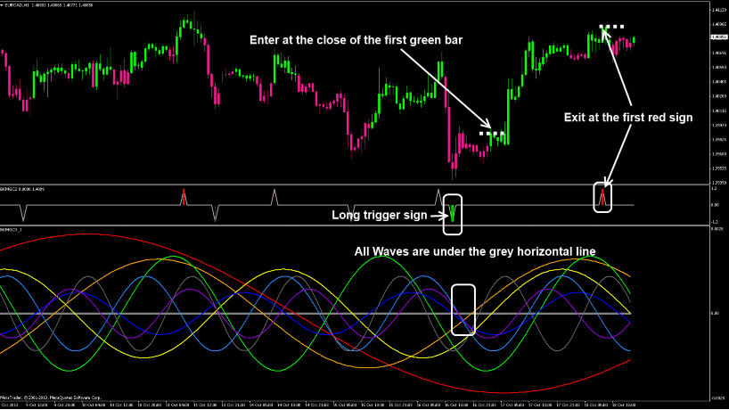 2) Long: if you got a long trigger on the BKMGC_2 indicator, you should look at the BKMGC_3 indicator to show all the cycle lines under the grey horizontal line (This means that the down cycles are about to finish and the up cycles are about to start). This must happen within 10-20 bars from the green line printed by the BKMGC_2 indicator.