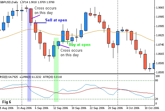 We BUY when RSI crosses themoving average from below (green box and line) and SELL when it crosses fromabove (blue box and line). It is vital to note that a cross is only validated after the