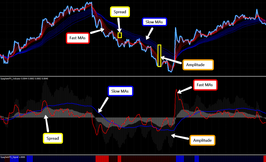Spaghetti FX indicator is synthesized from two types of moving averages: fast and slow.