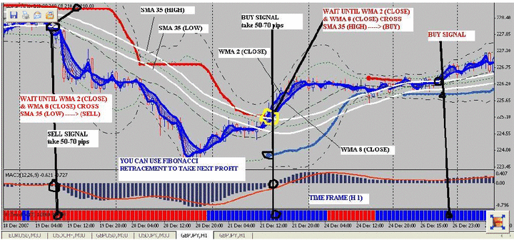 MACD<0; FX Trend with red bars. Buy Wait until WMA (2) and WMA (8) cross above 35 period Simple Moving Average; MACD>0;